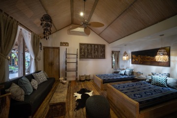 - Master suite with two separate bedrooms. A large room with a double bed right by the pool and a view of the sea. It has a large bathroom with a bathtub, a dressing room, and an outdoor shower with a view of Mount Agung. A small bedroom with two beds and an optional extra bed. The suite is available for a family, a group of friends, as well as a couple. The bathroom is accessed from the smaller bedroom via the master bedroom. The total area of the room is 57 m2.